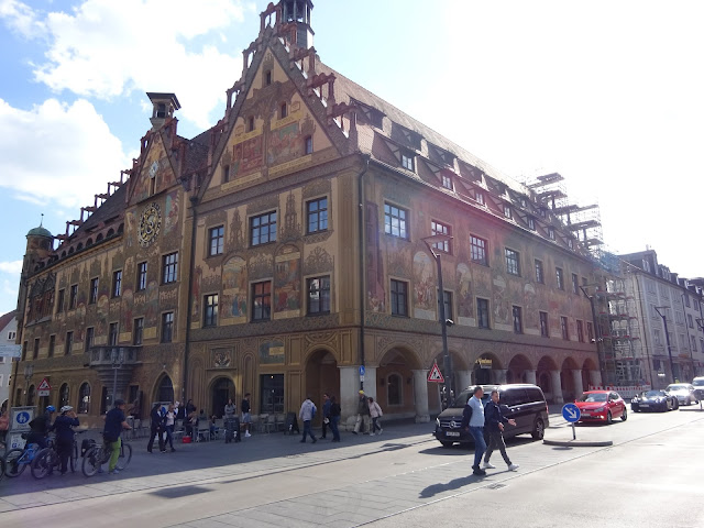 I walk inside and check out the hot food--there's chicken legs and several variations of ham but, not the item I'm hoping to find. As I turn to exit a woman comes out from the back carrying a tray. Whoa, there it is! See that piece of meat to the right of the chicken legs? That my friends is a pork roast German-style. The top is crispy and crunchy (it's fat). The white you see in the middle is fat and the meat is juicy and tender. The woman cuts a big slice of the pork, puts it on a sandwich roll and adds some mustard. I've been going crazy for these pork sandwiches for years. The price is right too--usually around $3.50. Absolutely delicious! The correct name of Biberach (population 32,000) is Biberach an der Riss. Riss is the name of the river running through town and eventually flowing into the Danube. This is the main square with the tower of St. Martin's church in the background.